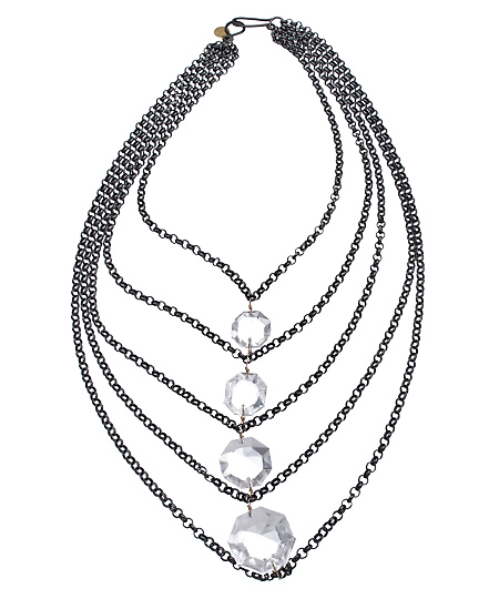When ordinary just won't do, reach for this incredible crystal layered gunmetal necklace from Wendy Mink. Multiple strands of gunmetal chains showcase clear kaleidoscope inspired crystals. This edgy layered look, falls over your outfit with intricate glam and stunning detail
