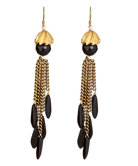 Dress your ears with these stunning fringe and dagger earrings by Wendy Mink. Six chain fringes with glass daggers fall from a 22k yellow gold vermeil cap. A sole black onyx round sits under the cap of these earrings.