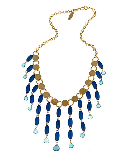 The Wendy Mink fringed necklace shimmers in beautiful shades of blue and gold. Flattened 18k gold-plate disks detail the center of the necklace from which beaded strands of varying lengths fall. Each strand features blue wood beads with light blue apatite drop details. This artful necklace fastens with a hooked clasp.