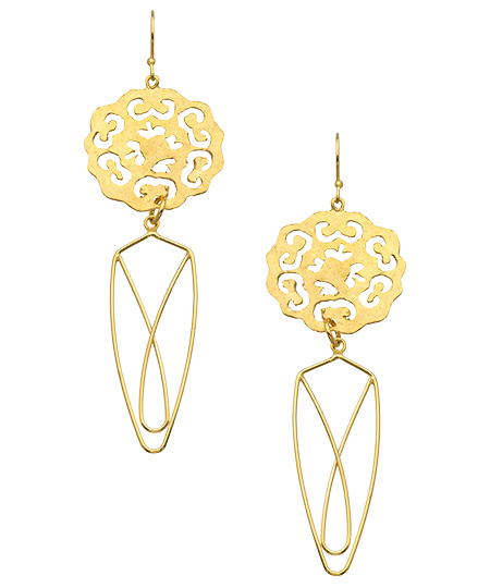 You are sure to leave a stylish impression with Wendy Mink's gold cut-out flower drop earrings. The open metal work with wire leaves dangling beneath, magnify the beauty of any ensemble. Freshen up your everyday look with this brilliant blossom.