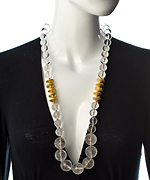 Fabulously dramatic, the knotted crystal bead disc necklace from Wendy Mink makes a sensational statement. The design features a strand of large faceted crystal beads adorned with two stations of gold discs for added glamor. The clear rock crystal beads have a go-with-anything vibe.