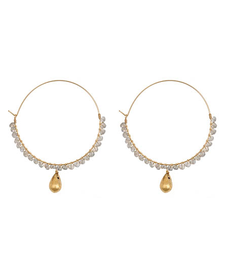 These labradorite and teardrop earrings by Wendy Mink are wrapped with great elegance. A cluster of labradorite stones line the bottom of the 22k yellow gold vermeil hoop earrings. A stunning vermeil teardrop dangles at the bottom.