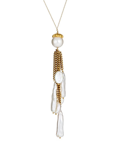 This dazzling Wendy Mink mother of pearl necklace features a thin gold chain and mother of pearl beads. The pearls are capped with gold vermeil, leading to a cluster of gold chains with mother of pearl sticks and oval drops at the end. The necklace is elegant, yet simple in design.