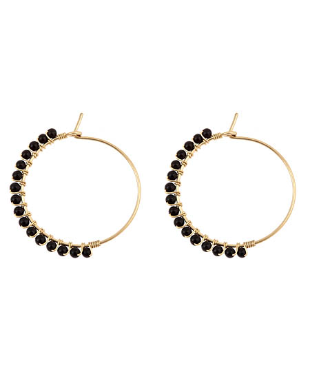 These Wendy Mink small black onyx hoops are perfect for everyday use. Lightweight and comfortable, the small hoops add the perfect finishing touch to any outfit. The bottom half of the hoop is accentuated with small black onyx stones wrapped around the gold. The earrings are 1 ¼ inch in diameter.