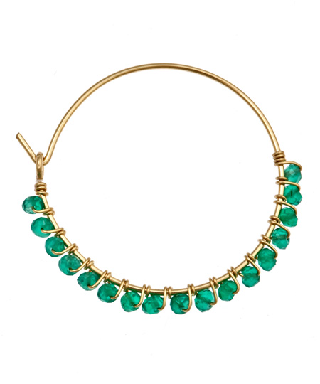 Wendy Mink small green onyx hoop earrings are delicate and dazzling. Vibrant green onyx stones are wire wrapped to 22k yellow gold vermeil hoops. Each beautiful earring measures 1 1/4 inches in diameter as it dangles from your ear. French wires for pierced ears.