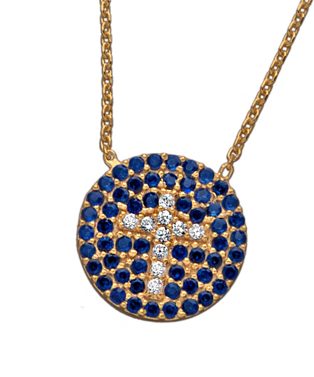 The white cross disk pendant necklace illuminates the cross in white cubic zirconias for a graphic touch. The cross appears on a yellow-gold vermeil disc and is surrounded by blue pave cubic zirconias. The delicate chain necklace fastens with a spring-ring clasp.