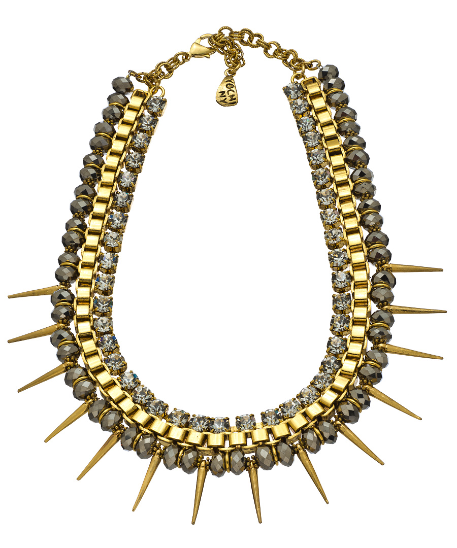 Have a little fun with your look by slipping on this edgy crystal gold spike necklace from Yochi! Pyrite stones and Austrian crystals intertwine on a gold box chain with spikes, for a 'rocker-chic' vibe. It's gonna be an exciting day!