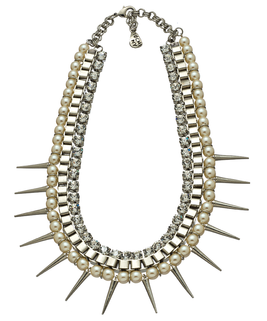 Yochi is challenging you to play fashion dangerously with this striking crystal silver spike necklace! Shiny spikes dart out on a multi layered necklace accented with pearls and illuminating Austrian crystals. This edgy neckpiece pairs well with your favorite tees & LBD's!