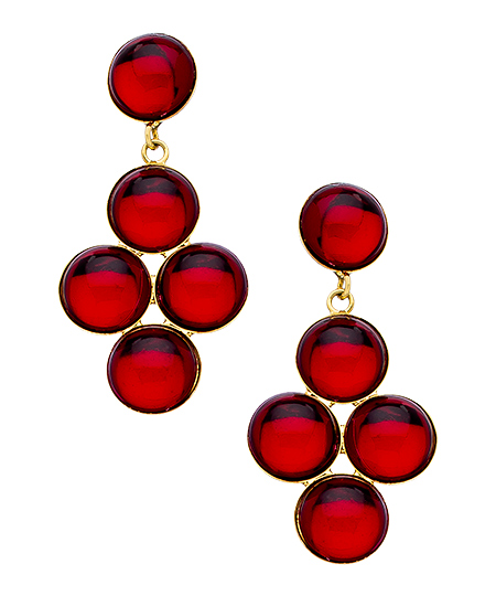 Whether they're worn to provide a pop of color, or you consider red your signature color, these Yochi gold and red cabochon chandelier earrings are a must-have! Four deep red cabochon stones are arranged in a diamond pattern and caught at the top with a solitary red cabochon. Earrings have a post closure for pierced ears.