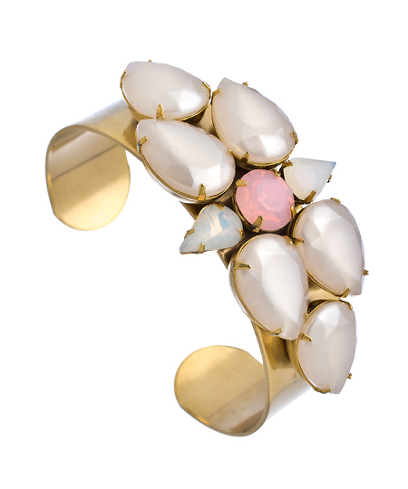 This gold and white stone petal ornament cuff bracelet from Yochi is the epitome of feminine elegance. Luminous white, teardrop shaped stones surround a beautiful, shimmering, round pink stone - all set on a gleaming gold cuff. Bracelet is adjustable for the perfect fit.