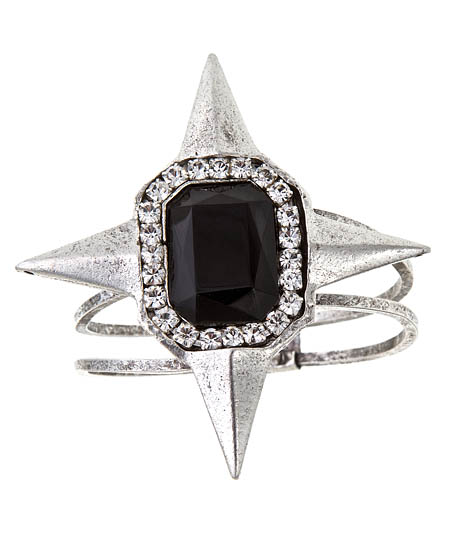 Choose this statement bracelet by Yochi for any occasion. Featured is a unique pointed star pendant with a elegant and classic black stone. The hinge cuff bracelet is wearable for all wrist sizes.