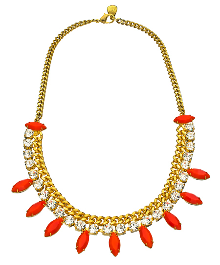 Yochi's rhinestone, orange stone and flat chain necklace is a study in sparkle! Bright marquise shaped orange spikes provide contrast to the brilliant large rhinestones that connect to the large, flat gold chain.