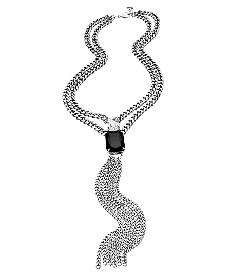 Two thicknesses of curb chain - one a necklace, one a tassel, separate the double stone detail of this modern and edgy Yochi silver double stone and tassel necklace. An emerald shaped, faceted black stone is topped by a sparkling, faceted, emerald shaped clear stone. The effect is simply stunning! Necklace has a lobster claw clasp.