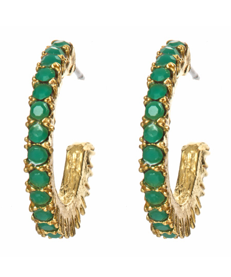 Yochi small green hoop earrings are perfect for inspiring a little envy within your friends. Tiny green glass stones are faceted for a hint of shine set in yellow gold plated brass. Measuring a quaint 7/8 inches in diameter, this little pair is sure to cause a large stir. Posts for pierced ears.