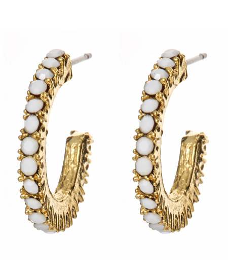 Yochi small white hoop earrings are perfect accessories for any ensemble. Tiny faceted white glass stones are set in yellow gold plated brass earrings. Each earring measures a total of 7/8 inch in diameter to add just the right amount of flash to your outfit. Posts for pierced ears.
