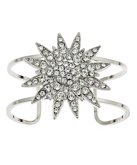 Yochi's starburst cuff is an atomic boom of dazzle and light. The Art Deco-inspired shape is ablaze with faceted crystals and affixed to a shining silver plated cuff. It's perfect for those who like their glamour with a little wit.