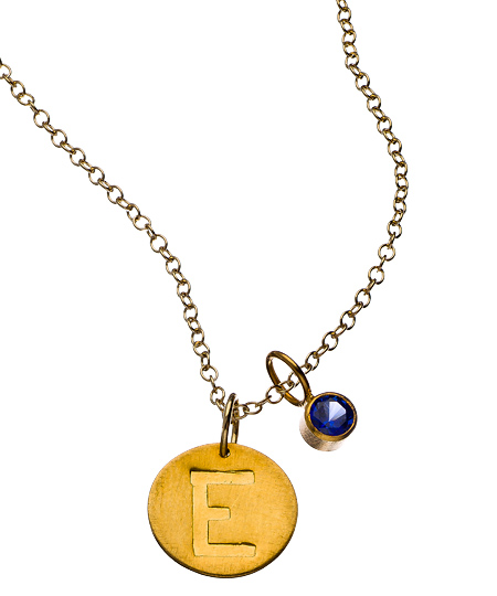 The gold embossed disc birthstone necklace from Zina Kao is the perfect modest personalized piece. A round disc pendant gives you the ability to add any letter you like and accent it with a radiant birthstone pendant. A small pearl is included on the end of the extender. This necklace fastens with a lobster claw closure.