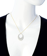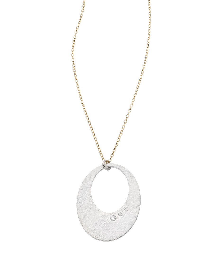 Accented with three sparkling CZ stones, this Zina Kao silver, gold and CZ punched oval hoop pendant necklace is bold and elegant - just the right piece to accentuate your beauty! The oval pendant is artisan crafted with dazzling CZs for a stunning effect. This glamorous necklace will be cherished for years to come. Necklace fastens with a lobster claw clasp.