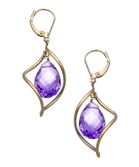 The eye-catching purple amethysts take center stage, dangling inside of 14-karat gold spiral frames. Pair it with