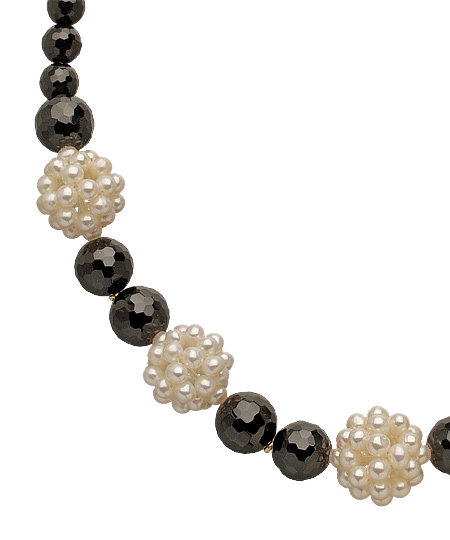 Dazzling clusters of white pearls punctuate this Zoe B. onyx and pearl popcorn necklace. Two sizes of faceted onyx beads are strung across the full length of this glittering 16-inch necklace. A 14k gold spring-ring clasp provides the finishing touch.